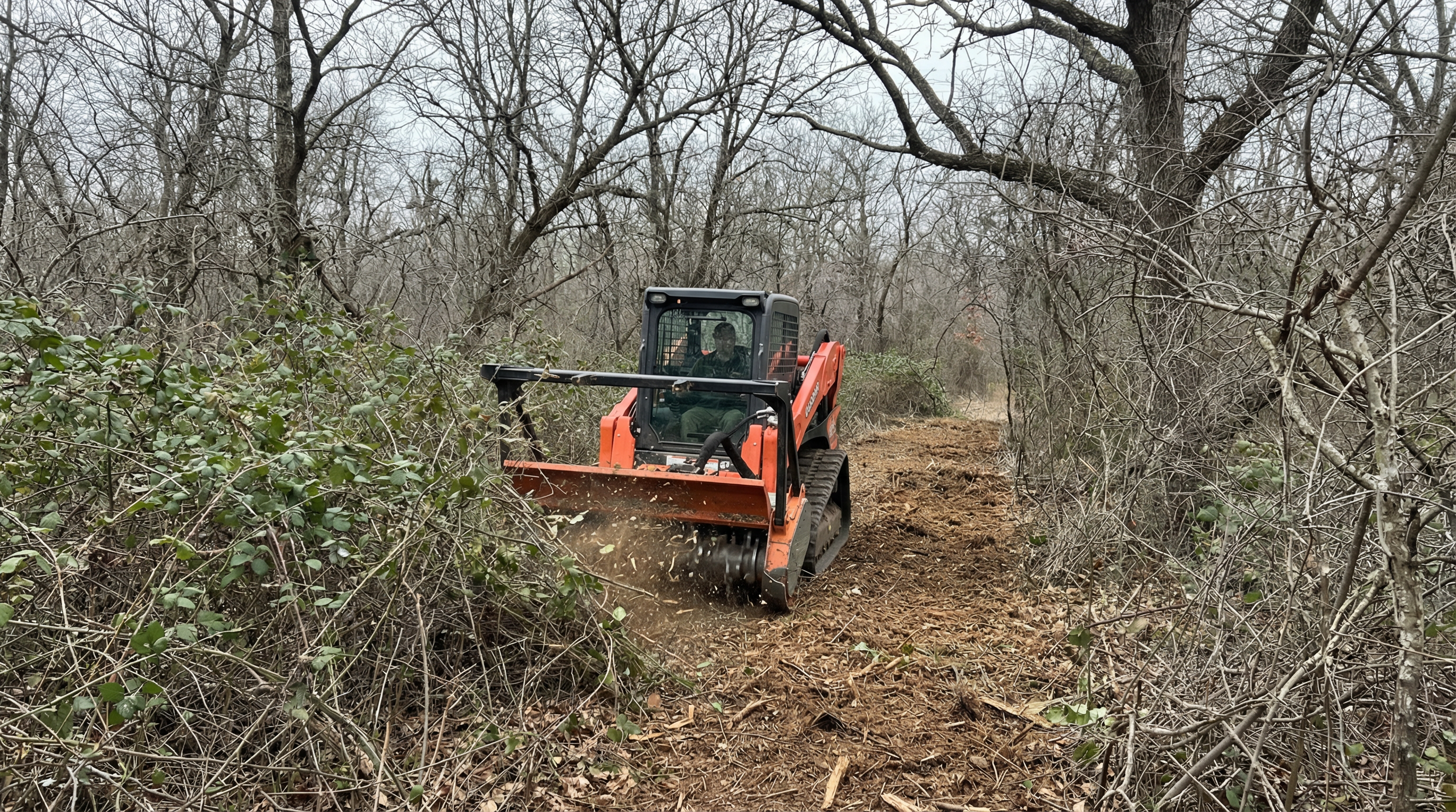 Our forestry mulcher grinds everything at ground level. Brush, saplings, vines, small trees — it all becomes mulch. Larger trees over 6-8 inches get chainsaw prep first, then the mulcher processes the rest.